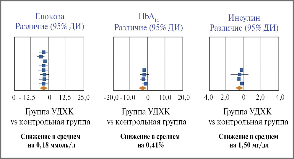 Представляют интерес данные систематического обзора и метаанализа клинических исследований, которые опубликованы в 2018 г. [32]. Показан эффект УДХК, применяемой в различных дозах продолжительностью от 6 нед до 2 лет, на гликемические параметры.