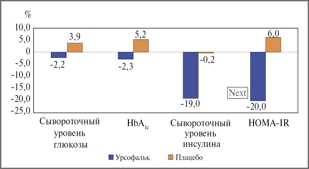 Согласно данным представленного исследования выявлены дополнительные эффекты высоких доз УДХК (дозировка 25–30 мг/кг) при НАСГ. Продемонстрировано улучшение показателей углеводного обмена при СД 2 и нарушении толерантности к глюкозе (рис. 4) [38].