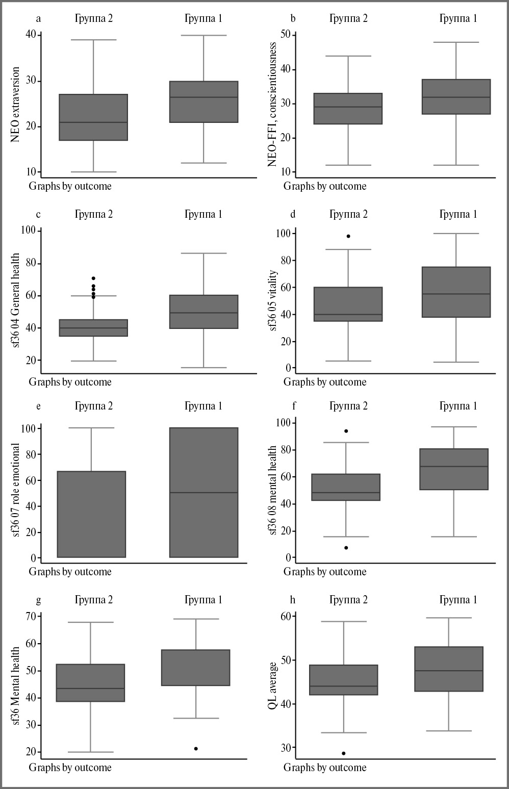 2. Fig. 1. The difference in significant indicators between the two groups: a – "extroversion" (NEO-FFI, extraversion); b – "conscientiousness" (NEO-FFI, conscientiousness); c – "general state of health" (SF-36); d – "vital activity" (SF-36); e – "role functioning, due to the emotional state" (SF-36); f – "mental health" (SF-36); g – "psychological component of health" (SF-36); h – is the total score on the SF-36 scale.