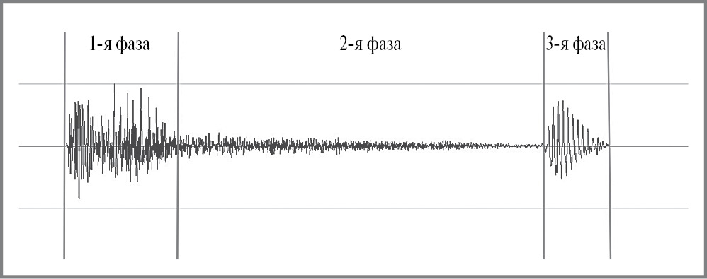 - переход между 2 и 3-й фазами характеризуется повышением амплитуды звуковой волны на 50% и более в пределах 20 мс.