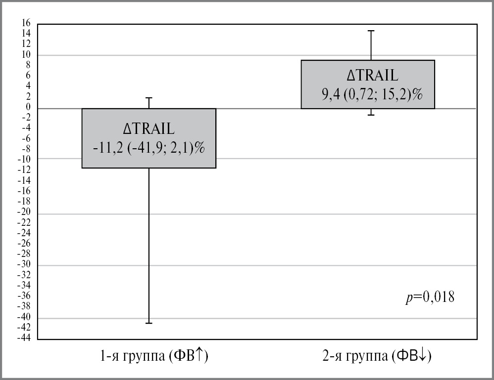 ΔTRAIL, % | -11,2 (-41,9; 2,1) | 9,45 (-0,72; 15,2) | 0,018 |