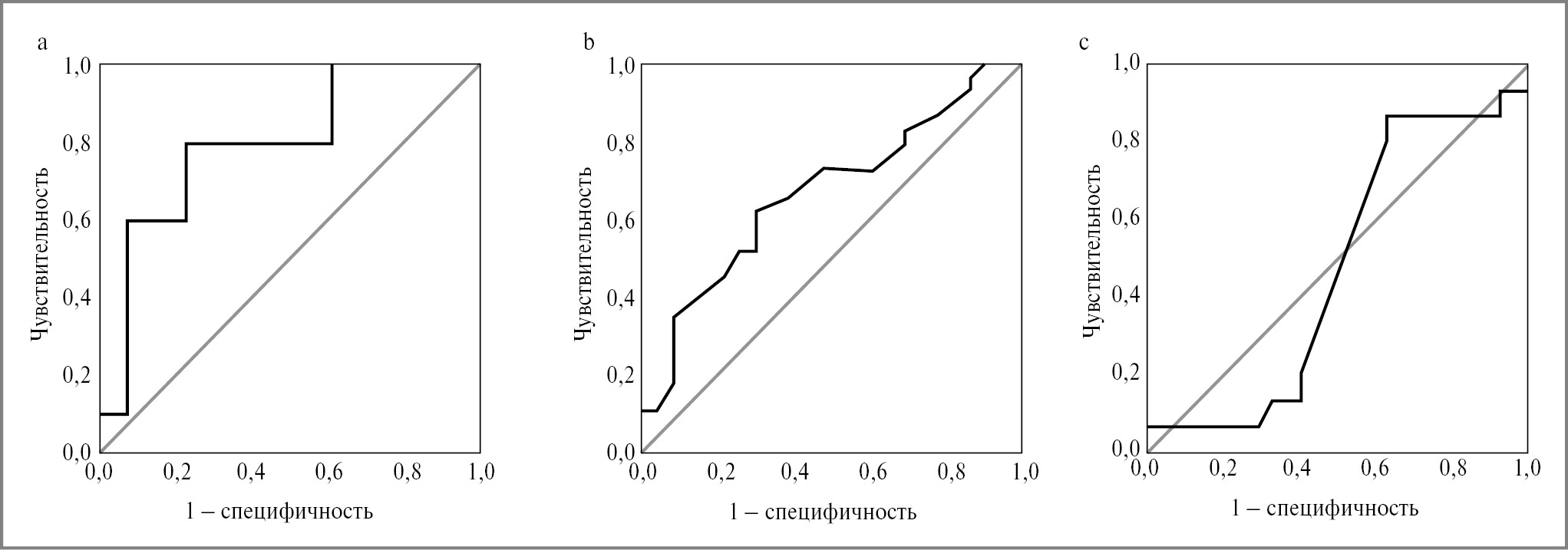 Рис. 2. ROC-анализ ассоциаций: a – периоперационной динамики TRAIL с характером изменения ФВЛЖ при годичном наблюдении; b – возраста пациентов с характером изменения ФВЛЖ при годичном наблюдении; c – СД 2 с динамикой ФВЛЖ при годичном наблюдении.