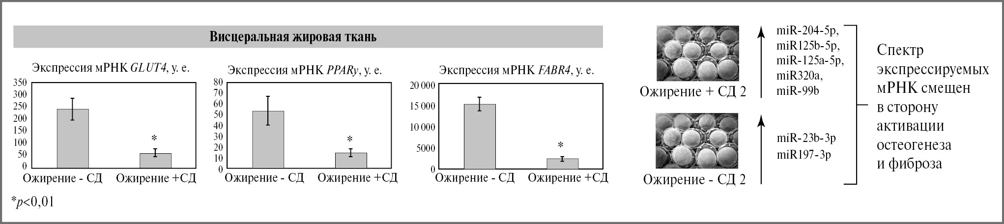 Образцы висцеральной жировой ткани у пациентов с ожирением с СД 2 и без СД 2 исследованы в отношении экспрессии генов адипогенной дифференцировки (мРНК GLUT4, PPARy и FABP4). Обнаружено значимое снижение экспрессии этих генов у лиц с СД 2 (рис. 1). Кроме того, в ходе изучения полногеномных профилей экспрессии мРНК и микроРНК обнаружены 7 дифференциально экспрессирующихся микроРНК с уровнем значимости <0,1 после поправки на множественность сравнений. Пять из них имели повышенный уровень экспрессии в группе пациентов с СД 2: miR-204-5p, miR125b-5p, miR-125a-5p, miR320a, miR-99b, а 2 имели повышенный уровень экспрессии в группе пациентов без СД 2: miR-23b-3p и miR197-3p. Эти 7 микроРНК нацелены на 2 группы генов: матриксные металлопротеиназы и гены сигнального пути трансформирующего фактора роста β (см. рис. 1). Полученные данные свидетельствуют, что у больных СД 2 в большей степени активированы гены, регулирующие не адипогенную, но остеогенную дифференцировку жировой ткани [16]. В настоящее время наличие антагонистических взаимоотношений между процессами адипогенной и остеогенной дифференцировок является достаточно известным фактом [17]. Таким образом, можно предположить, что риск развития СД 2 у лиц с ожирением выше в том случае, если имеется смещение дифференцировки МСК жировых клеток в остеогенном направлении, что препятствует адипогенной дифференцировке и тем самым способствует развитию инсулиновой резистентности.