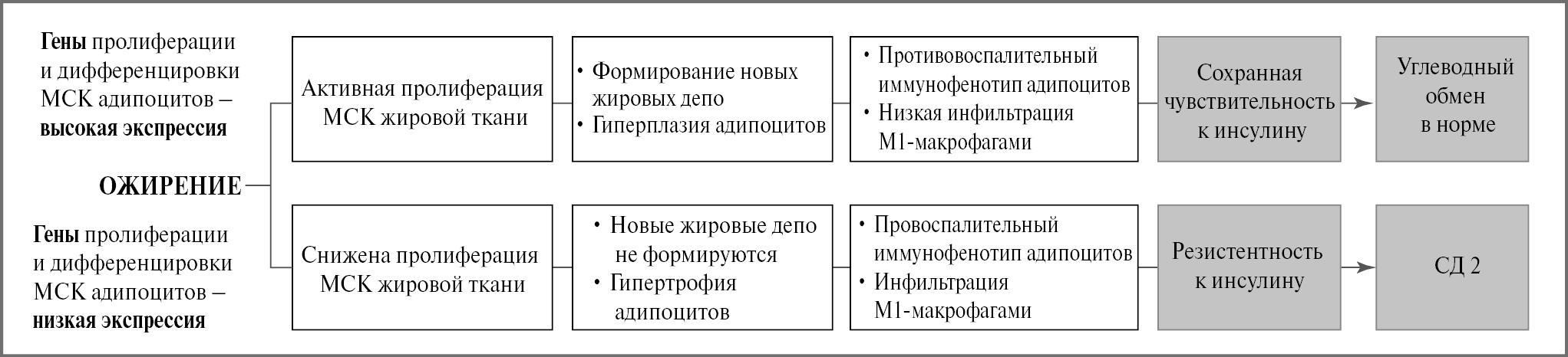 Подводя итог проведенным исследованиям, можно констатировать, что риски развития СД 2 у лиц с ожирением определяются взаимодействием генетических, клеточных и гормональных факторов. Ключевым звеном риска диабетогенных изменений является активность генов, регулирующих пролиферацию и дифференцировку МСК адипоцитов: СД 2 развивается у тех людей, у которых нарушены пролиферация и адипогенная дифференцировка стволовых клеток. У таких пациентов формируется дефицит жировых депо, и в условиях продолжающегося поступления килокалорий происходит гипертрофия (увеличение в размерах) и перерастягивание старых адипоцитов, что активирует инфильтрацию жировой ткани провоспалительными макрофагами. Развивается субклиническое воспаление с последующим снижением чувствительности ткани к инсулину и развитием СД 2.