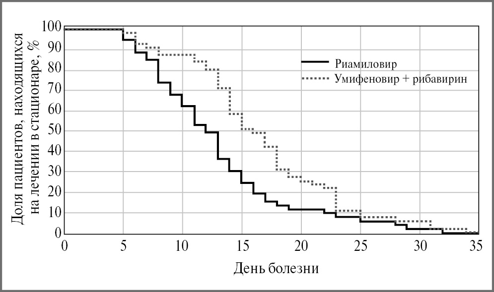 Рис. 1. Динамика уменьшения доли пациентов, находящихся на стационарном лечении, в зависимости от применяемой противовирусной терапии.