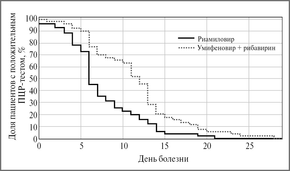 У пациентов, получавших риамиловир, клиническое улучшение наступало статистически значимо быстрее, чем в группе сравнения (рис. 1).