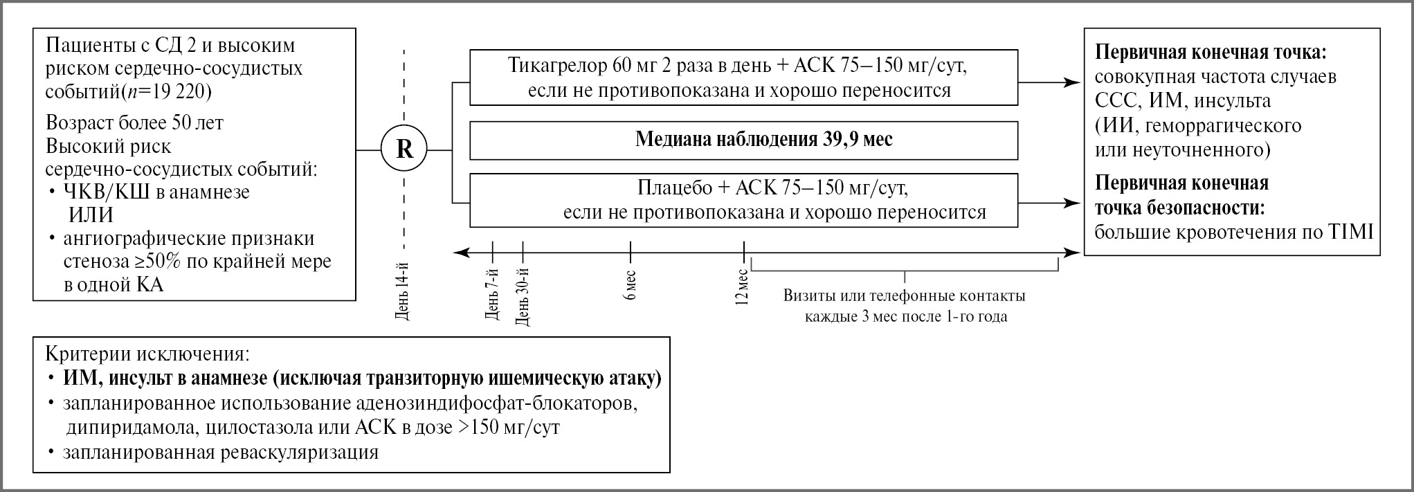 Основной целью исследования была оценка потенциальных преимуществ и рисков двойной АТТ АСК и тикагрелора в долгосрочной перспективе у больных со стабильной ИБС и СД 2.