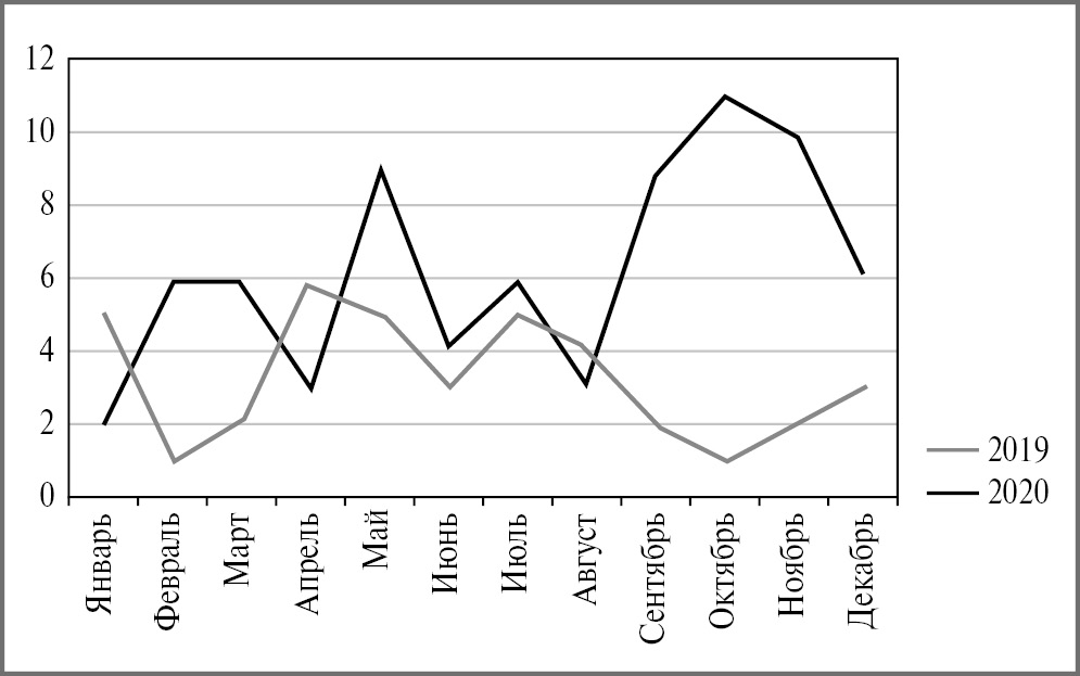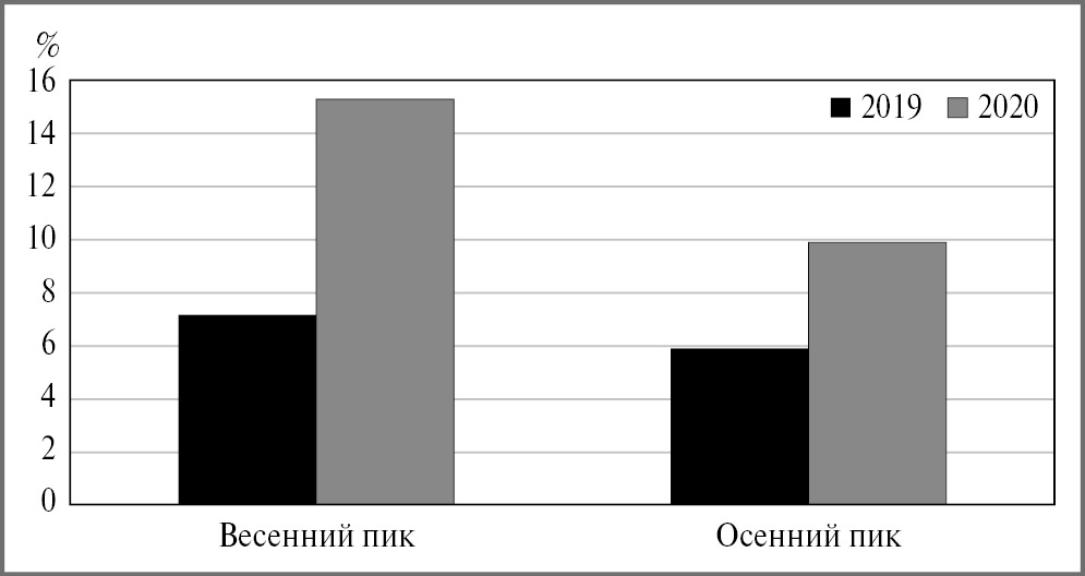 Зафиксировано 2 пика пневмоний – это май и сентябрь-ноябрь 2020 г. (см. рис. 1). В нашей статье мы будем их называть весенним и осенним периодами.