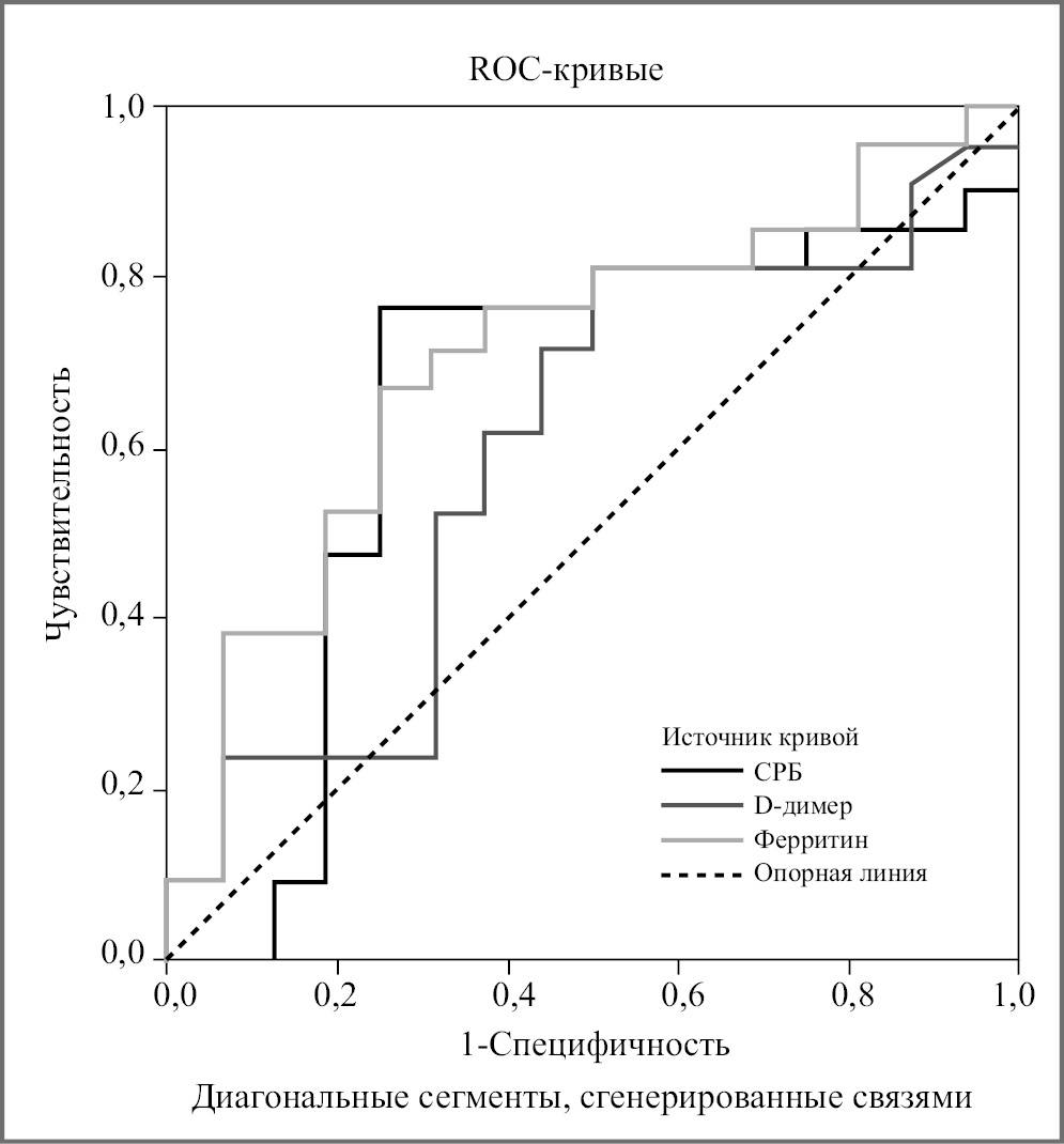 Проанализированные показатели (СРБ, D-димер, ферритин, возраст), имеющие статистическую значимость, представлены в виде ROC-кривой, с целью оценки валидности выборки и определения значения параметра, обладающего прогностической силой.