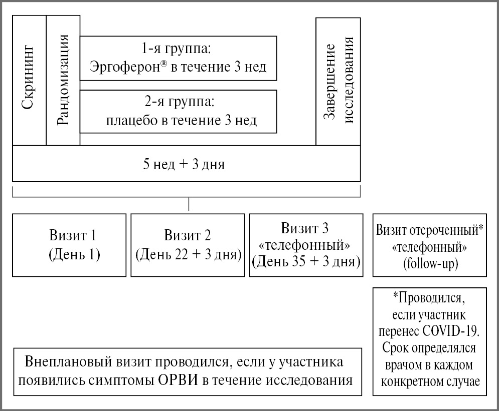 Общая продолжительность участия пациента в исследовании составила 5 нед + 3 дня и складывалась из 3-недельного периода профилактического приема препарата Эргоферон®/плацебо и 2 нед последующего наблюдения. За этот период осуществлялись 3 плановых Визита. При появлении в течение 5 нед наблюдения симптомов острой респираторной вирусной инфекции (ОРВИ): повышение температуры тела до фебрильных/субфебрильных значений, слабость, головная боль, озноб, кашель, боль в горле и т.п., врач проводил внеплановый визит с взятием мазков со слизистой оболочки носо- и ротоглотки для ОТ-ПЦР исследования в центральной лаборатории CMD – Центре молекулярной диагностики ФБУН «ЦНИИ эпидемиологии» Роспотребнадзора. При выявлении лабораторно подтвержденного случая SARS-CoV-2 инфекции с симптомами или без них участие в исследовании досрочно завершалось в связи с достижением первичной конечной точки. В соответствии с требованиями Роспотребнадзора информация передавалась в лечебно-профилактическое учреждение, к которому прикреплен участник РКИ, для оказания необходимой медицинской помощи согласно действующим на тот момент рекомендациям и стандартам. Репортирование данных о случае COVID-19 осуществлялось в соответствии с рекомендациями Минздрава России и правилами лечебно-профилактического учреждения. Если у участника диагностировали COVID-19, то проводился отсроченный «телефонный» (follow-up) визит. Срок визита определял врач-исследователь в каждом конкретном случае.
