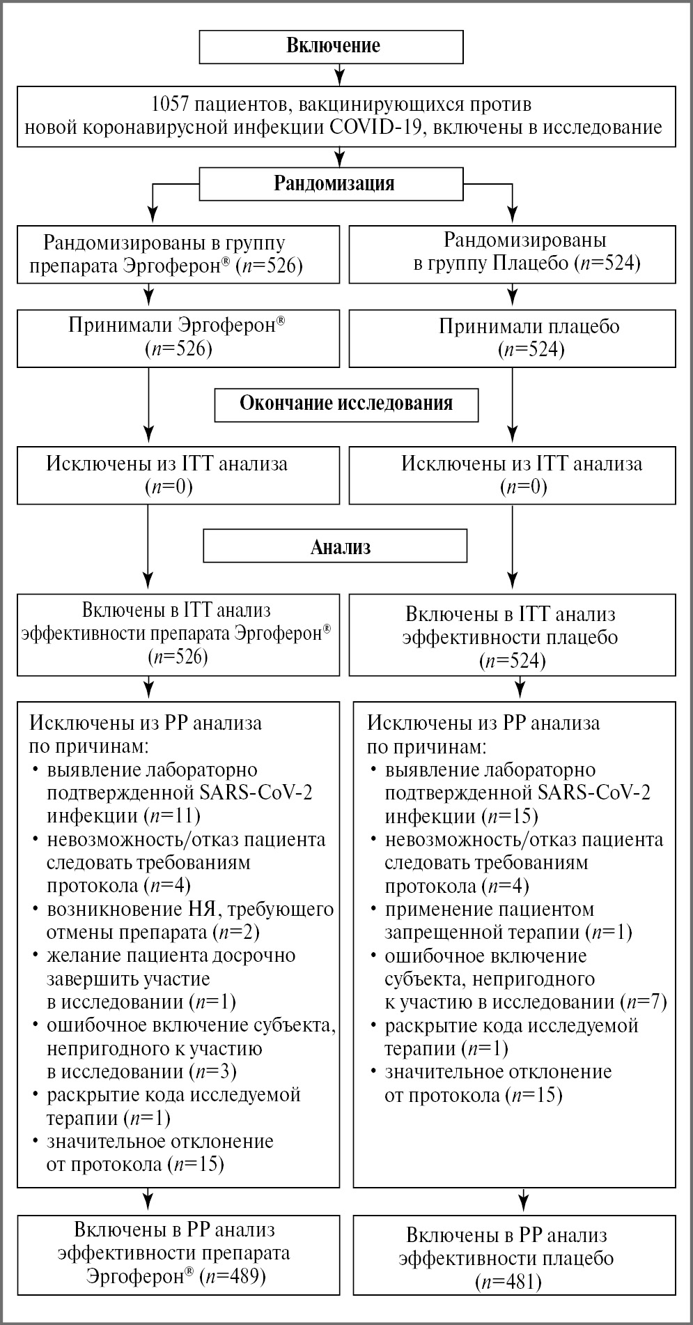 На этапе отбора в РКИ включены 1057 пациентов (Total set) мужского и женского пола в возрасте старше 18 лет, которые получили I компонент вакцины против новой коронавирусной инфекции (COVID-19) и подписали ФИС на участие в исследовании. Семь пациентов в связи с несоответствием критериям включения и невключения не прошли этап скрининга. После прохождения процедур скрининга 1050 участников рандомизированы в 2 группы: 526 человек в 1-ю группу, получавшую Эргоферон® по новой профилактической схеме – 1 таблетка 2 раза в день в течение 3 нед, и 524 – во 2-ю группу, получавшую плацебо по схеме препарата Эргоферон®. Для обеспечения должной комплаентности исследуемой терапии на Визите 1 все участники информированы о правилах приема выданных препаратов. На последующих Визитах проводилась проверка соблюдения участниками правил приема препарата Эргоферон®/плацебо.