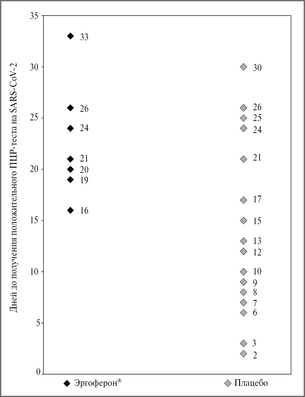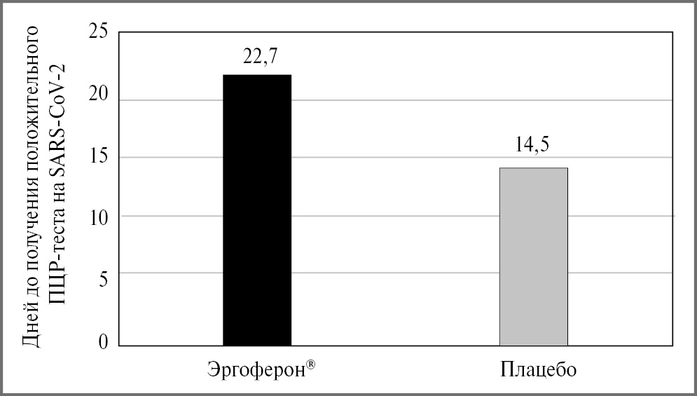 В ходе Post hoc анализа установлено, что среднее время от введения компонента I вакцины «Гам-КОВИД-Вак» до положительного ПЦР теста на SARS-CoV-2 в группе препарата Эргоферон® составило 22,7±5,6 дня (95% ДИ: 17,5–27,9), что значимо позже по сравнению с группой Плацебо – 14,5±8,3 дня (95% ДИ: 10,8–18,2; критерий Вилкоксона р=0,0363). Таким образом, дельта между препаратом Эргоферон® и плацебо составляет 8,21±7,76 дня (95% ДИ: 1,30–15,13); рис. 3.