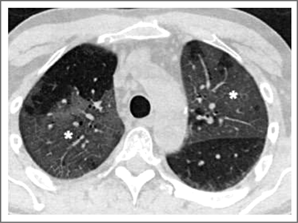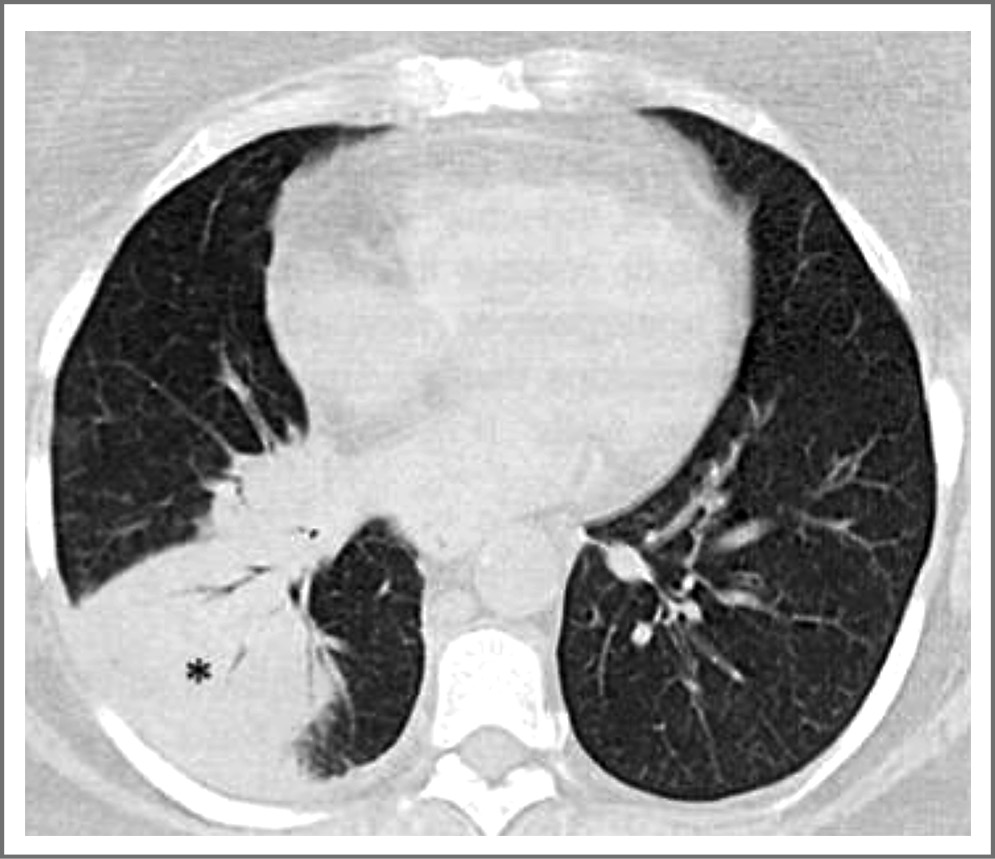На рис. 1 демонстрируется компьютерная томограмма (КТ) мужчины 42 лет, у которого в последние 2 сут отмечены высокая температура, выраженное общее недомогание, присоединился сухой непродуктивный кашель и дыхательный дискомфорт, положительный тест на SARS-CoV-2. Феномен «матового стекла» на КТ носит диффузный характер.