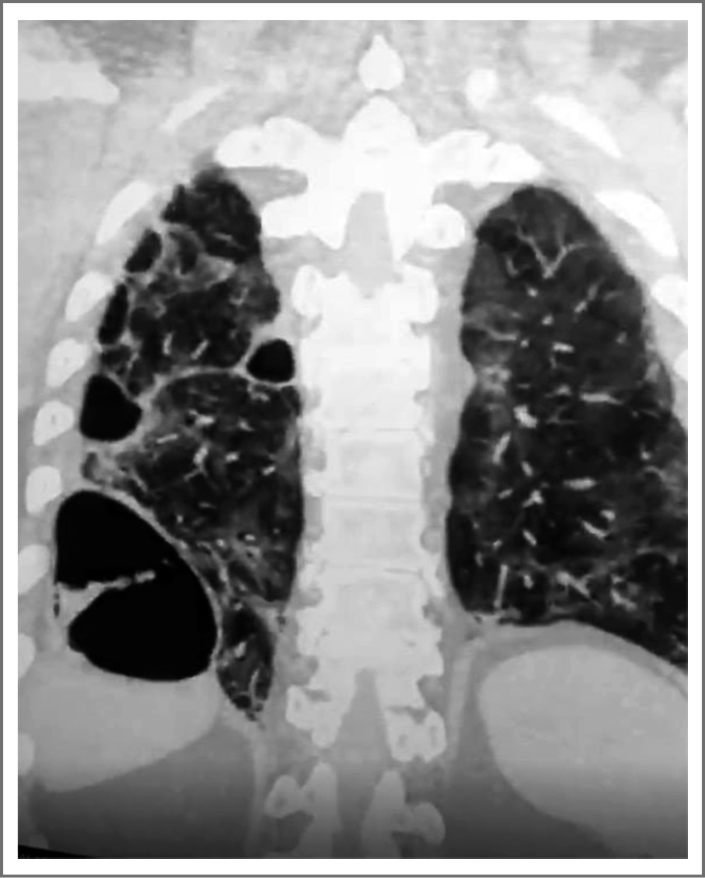Рис. 3. КТ органов грудной клетки больного, перенесшего в тяжелой форме COVID-19; буллезные изменения на фоне выраженного ФЛ. / Fig. 3. Thoracic CT of patients suffering from severe COVID-19; bulose changes against the background of pronounced pulmonary fibrosis.
