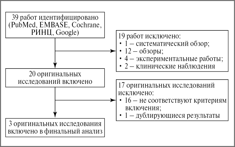 Поиск по электронным базам данных выявил 39 опубликованных работ для последующего анализа. Из них 19 исследований исключено, так как они не являлись оригинальными работами (1 – систематический обзор; 12 – обзоры; 4 – экспериментальные работы; 2 – клинические наблюдения). Отобранные 20 работ детально анализировались на соответствие критериям включения, после чего 17 исследований исключено (рис. 1). В итоге оставшиеся 3 оригинальных исследования, отвечающих критериям, включены в настоящий систематический обзор и метаанализ.