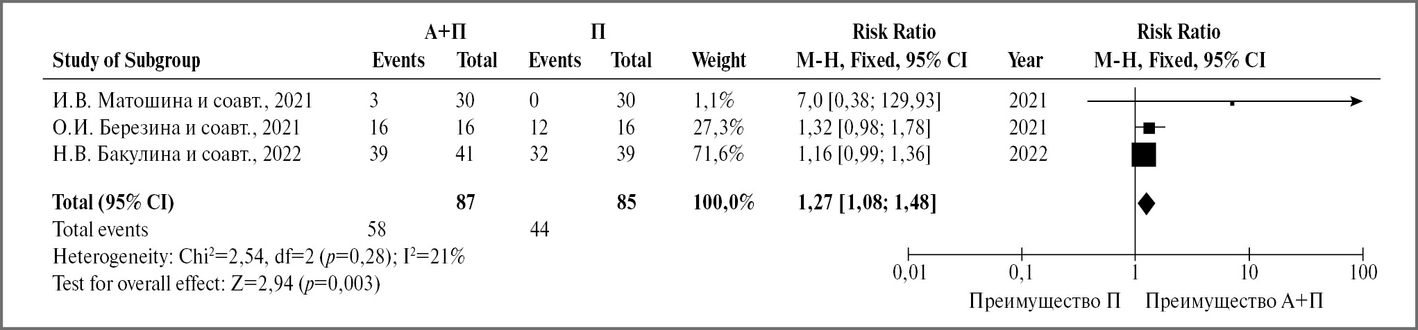 Полная эпителизация эрозий на 28-е сутки. Метаанализ 3 контролируемых исследований продемонстрировал, что комбинированная терапия с применением ИПП (пантопразола) и Альфазокса достоверно эффективнее монотерапии ИПП (пантопразола) в рамках полной эпителизации эрозий пищевода к 28-м суткам лечения (ОР 1,267, 95% ДИ 1,082–1,483, p=0,003); рис. 2. Значимой гетерогенности между результатами исследований не выявлено (p=0,2812; I2=21,19%), поэтому при результирующем анализе использовалась модель фиксированных эффектов.