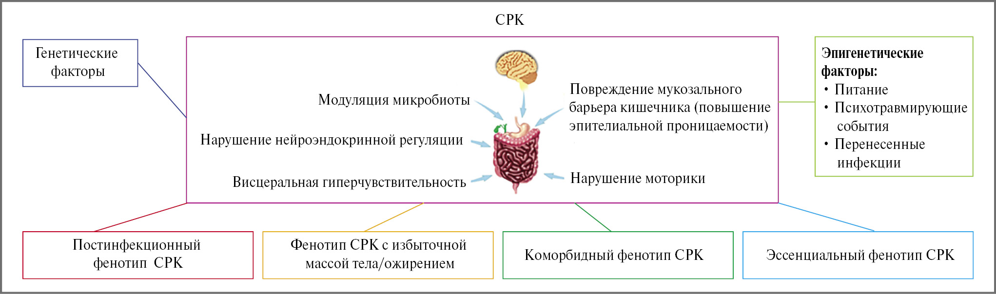 Одним из возможных шагов к улучшению результатов лечения любого хронического неинфекционного заболевания является разработка индивидуализированных подходов к курации, основанных на выделении фенотипов – совокупности признаков, присущих определенной группе пациентов и формирующихся на основе генотипа при участии факторов окружающей среды. В настоящее время активно изучается более 60 генов-кандидатов, ассоциированных с СРК [6], а в качестве основных эпигенетических факторов рассматриваются питание, стресс, наличие сопутствующих тревожно-депрессивных расстройств, перенесенная острая кишечная инфекция (ОКИ). Взаимодействие указанных факторов посредством изменения функции энтеральной нервной системы, процессов нейротрансмиссии, состояния мукозального барьера, модуляции кишечной микробиоты, развития воспаления низкой степени активности в конечном итоге приводит к формированию висцеральной гиперчувствительности и нарушению моторики кишечника [7]. При этом очевидно, что факторы генетики и эпигенетики могут вносить свой вклад в развитие СРК по-разному, и, вероятно, именно с этим связана гетерогенность когорты пациентов.