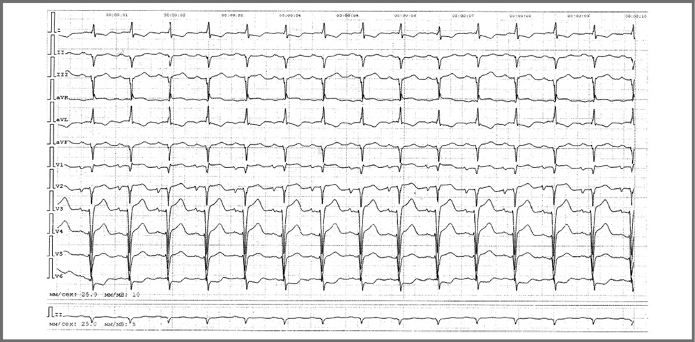 Рис. 1. Электрокардиограмма пациентки 40 лет с AL-амилоидозом с преимущественным поражением сердца, λ-вариант.