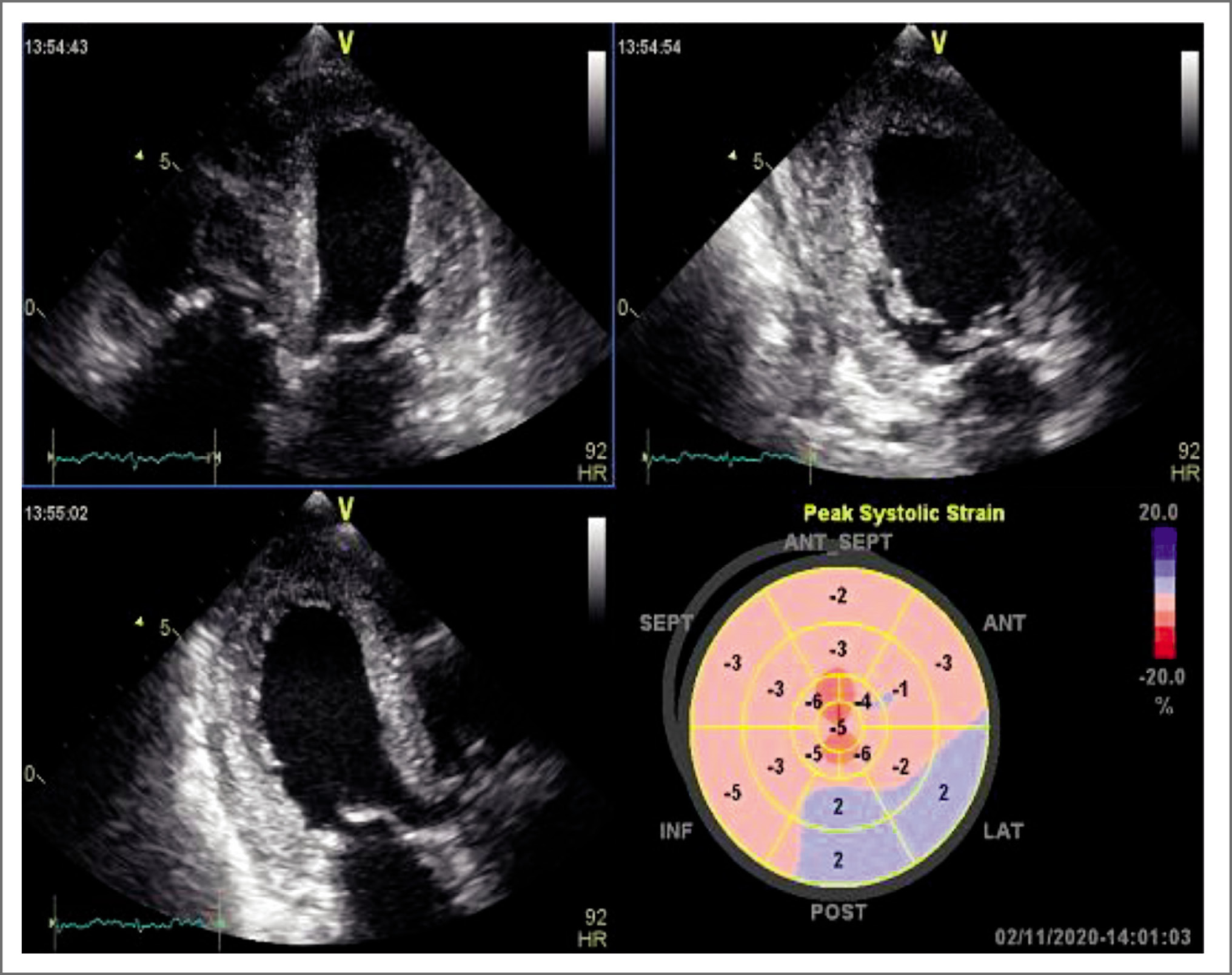Fig. 2. Echocardiography with Speckle-tracking technology. Global longitudinal strain index (GLS) significantly reduced – -2.5% (N<-20%).