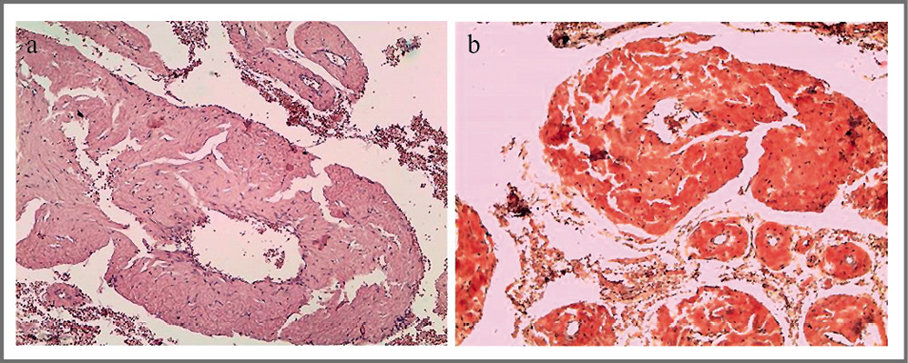 Fig. 3. Histological study of the colon edndobioptate. Staining with hematoxylin-eosin (a) and Congo red (b).