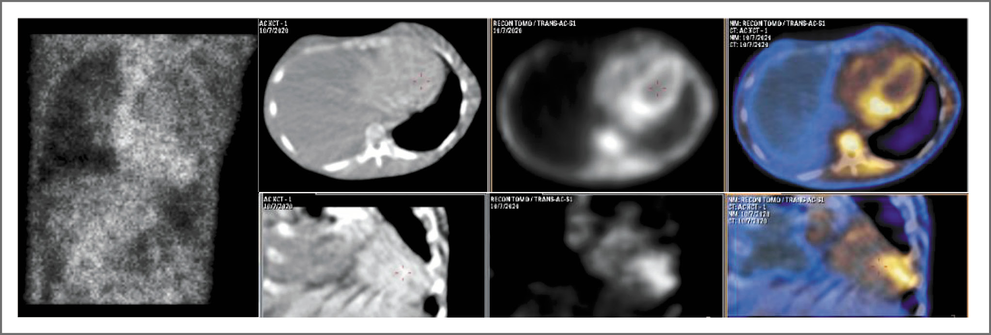 Рис. 4. Данные планарной сцинтиграфии, КТ, ОЭКТ и ОЭКТ/КТ пациента с верифицированным AL-амилоидозом. Визуализируется интенсивное накопление РФП во всем миокарде ЛЖ с очагами повышенного включения в апикальных и нижних сегментах (Grade 2–3).