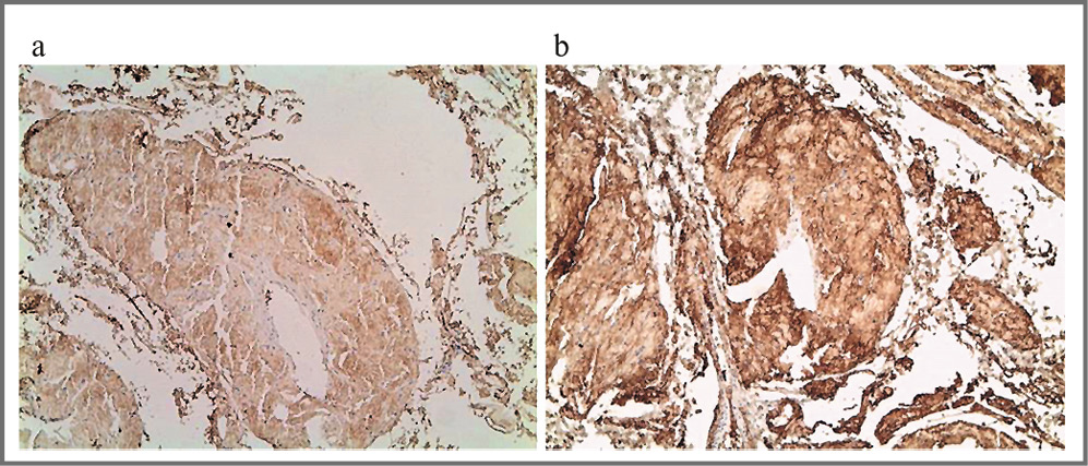 Рис. 5. Иммуногистохимическое исследование эндобиоптата прямой кишки. Преимущественно слабая (+) экспрессия Kappa light chain (clone CH15) (a) и выраженная (+++) экспрессия Lambda light chain (clone SHL53) (b).