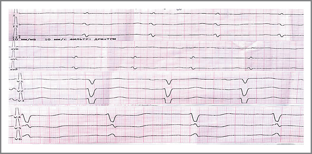 Инструментальные исследования. По ЭхоКГ: симметричная гипертрофия ЛЖ без обструкции ВОЛЖ, размеры и объемные показатели ЛЖ и правого желудочка в пределах нормальных значений, дилатация ЛП до 4,6 см. Обращает на себя внимание наличие диастолической дисфункции ЛЖ (ДДЛЖ) по II типу (рестриктивный), сохранная фракция выброса (ФВ) ЛЖ 62%, снижение ударного объема (УО) до 22 мл и сердечного индекса (СИ) до 0,9 л/мин/м2 (см. табл. 1). По ЭКГ на фоне синусового ритма прослеживался низкий вольтаж ЭКГ-отведений от конечностей, нарушение процессов реполяризации миокарда верхнебоковой области (косонисходящая депрессия сегмента ST, отрицательный зубец Т); рис. 1. По данным суточного мониторирования ЭКГ выявлены эпизоды желудочковой тахикардии (IVБ-градация по Лауну). Выполнена коронароангиография, по данным которой коронарные артерии (КА) без поражения, однако отмечено замедление кровотока по всем КА до TIMI 2 – шкале Thrombolysis In Myocardial Infarction (пульсирующий кровоток). По УЗИ органов брюшной полости: асцит, ЛАП. По рентгенографии органов грудной клетки: венозный застой 2-й степени, двусторонний гидроторакс.
