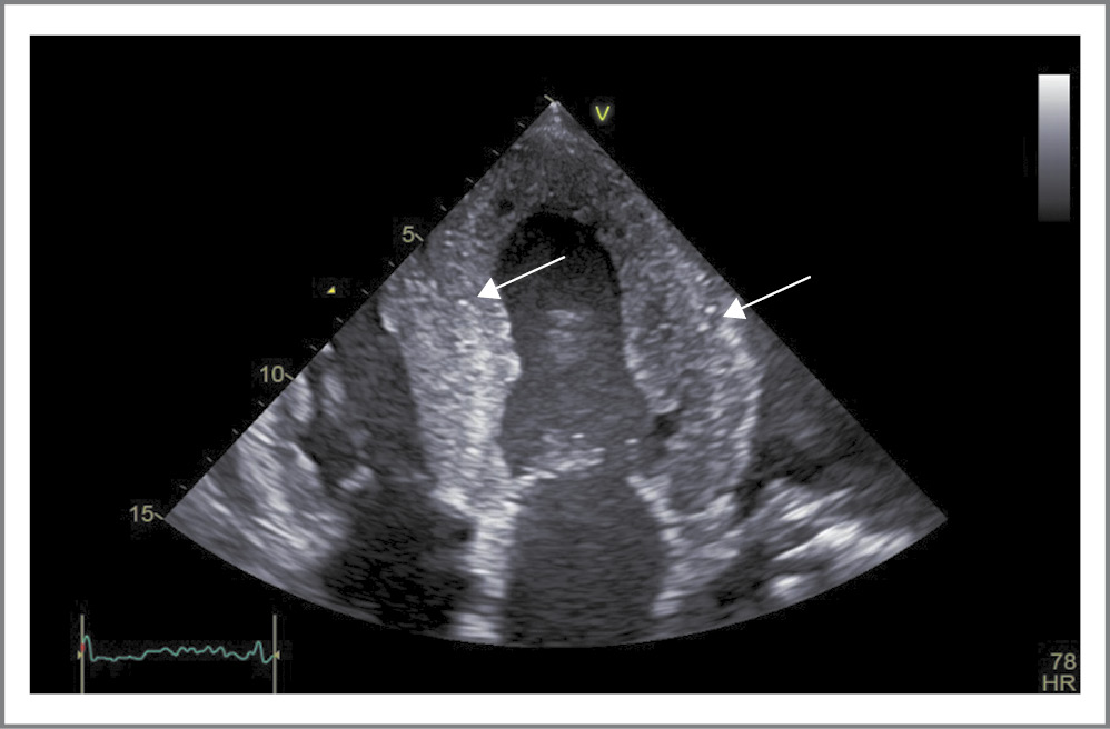 Fig. 2. Three-dimensional echocardiography (apical four-chamber section). Against the background of a pronounced symmetrical thickening of the walls of the left ventricle, there is a glow of the myocardium with hyperechoic inclusions – lumps of amyloid (indicated by arrows)