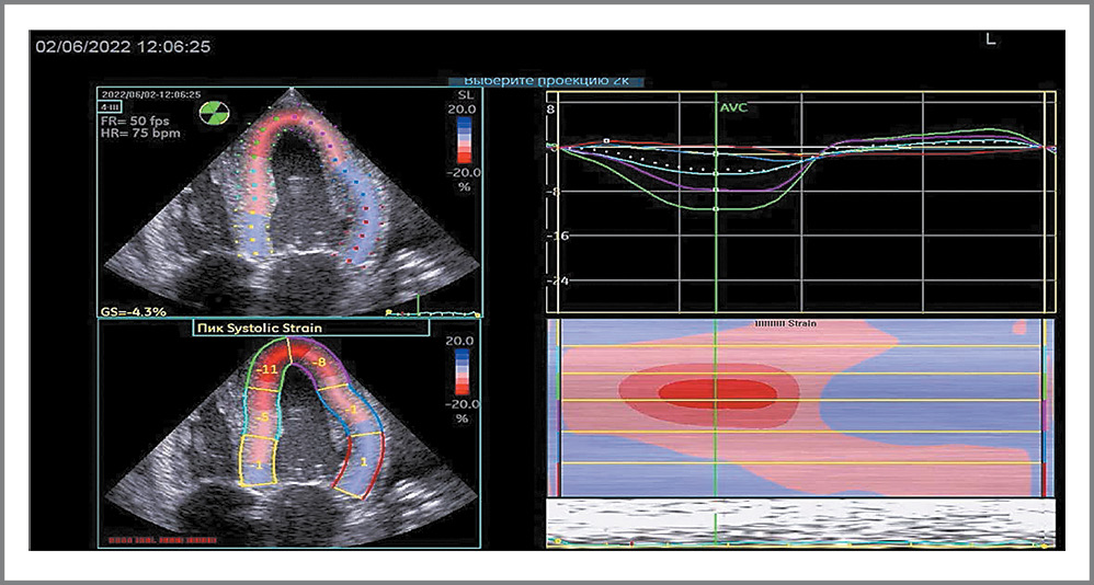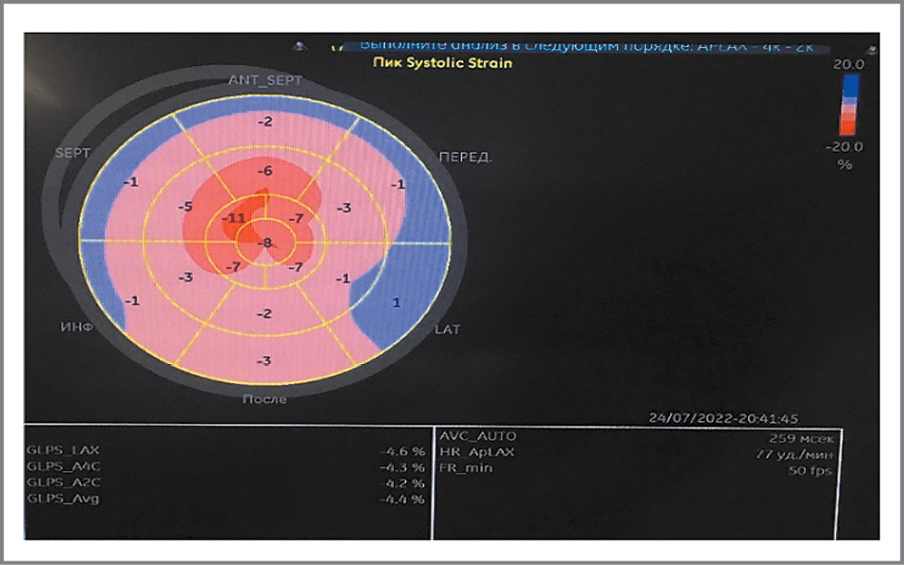 Инструментальные исследования. ЭхоКГ-исследование проведено на аппарате экспертного класса General Electric Vivid iq в ФГБНУ НИИ КПССЗ (см. табл. 1). Дополнительно, к ранее представленным данным, отмечалось снижение ФВ до 39%, а также «свечение» миокарда с гиперэхогенными включениями (рис. 2). Согласно современным рекомендациям [9] использована технология Speckle Tracking с оценкой деформации миокарда, по результатам которой выявлена типичная картина для амилоидоза сердца – выраженное снижение деформации средних и базальных сегментов ЛЖ с сохраненной деформацией верхушечных сегментов (рис. 3, 4). Показатель GLS (глобальной продольной деформации) снижен до -4,4%, через 14 дней он снизился до -3,6% (см. табл. 1). По УЗИ плевральных полостей – двусторонний гидроторакс (слева – 12 см, справа – 7,6 см). В рамках госпитализации магнитно-резонансную томографию с контрастированием гадолинием не проводили по техническим причинам.