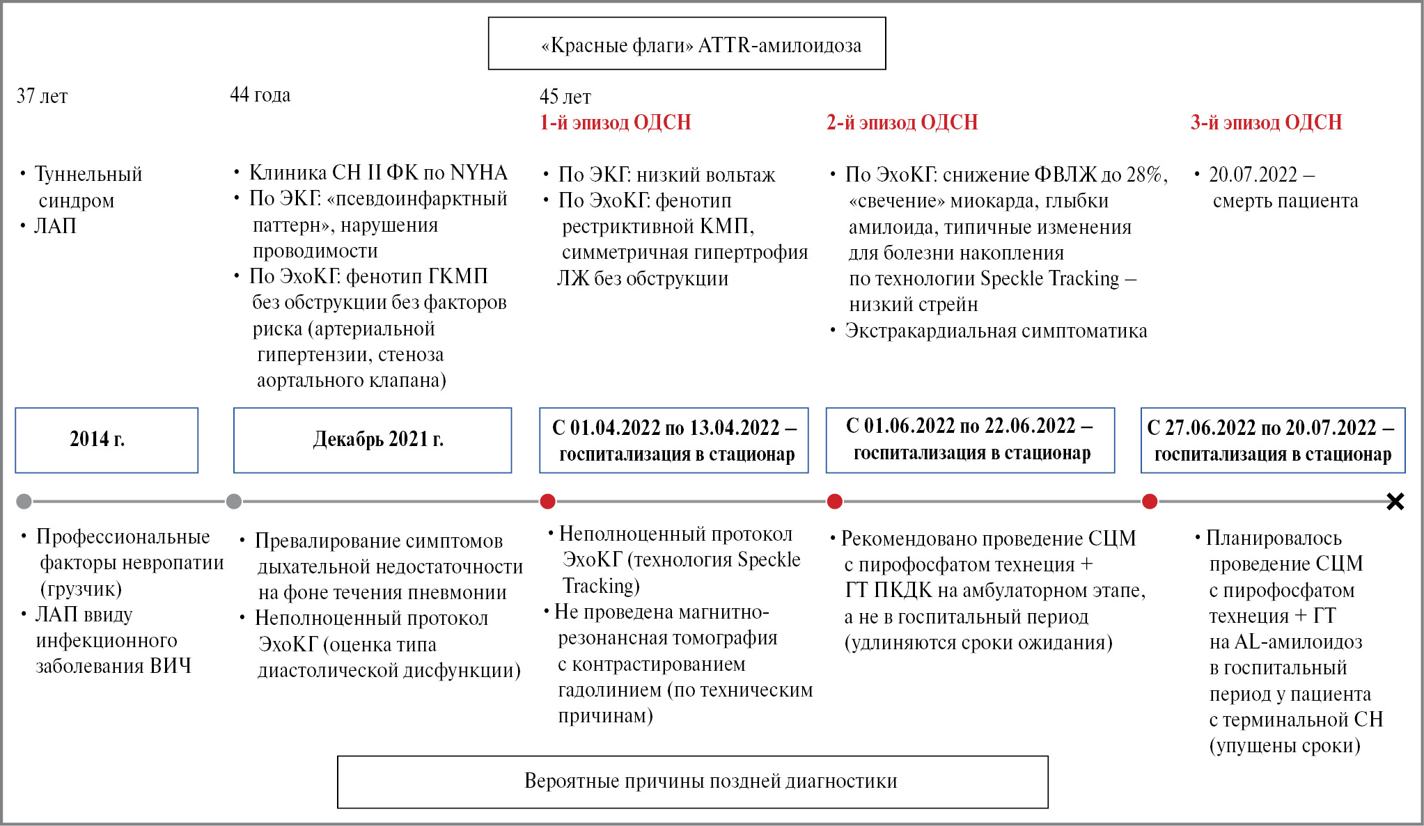 Несмотря на наличие «красных флагов», достижения в области визуализации сердца (расширение специфических критериев АКМП по ЭхоКГ), внедрение высокочувствительных и специфичных методов неинвазивной диагностики в рутинную практику (СЦМ), амилоидоз сердца остается все еще сложно диагностируемым заболеванием, особенно в ранние сроки, когда его лечение наиболее эффективно.