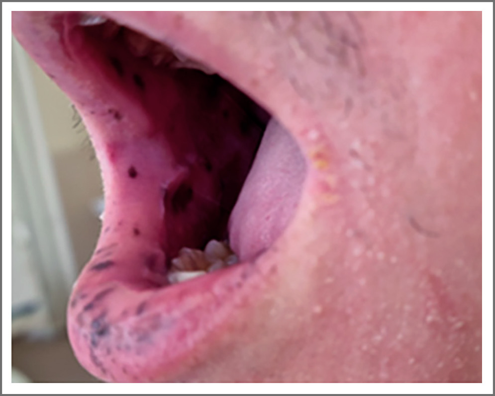 Рис. 1. Пигментные пятна на красной кайме губ и слизистой оболочке щек. / Fig. 1. Pigmented spots on the red border of the lips and on the mucous membrane of the cheeks.