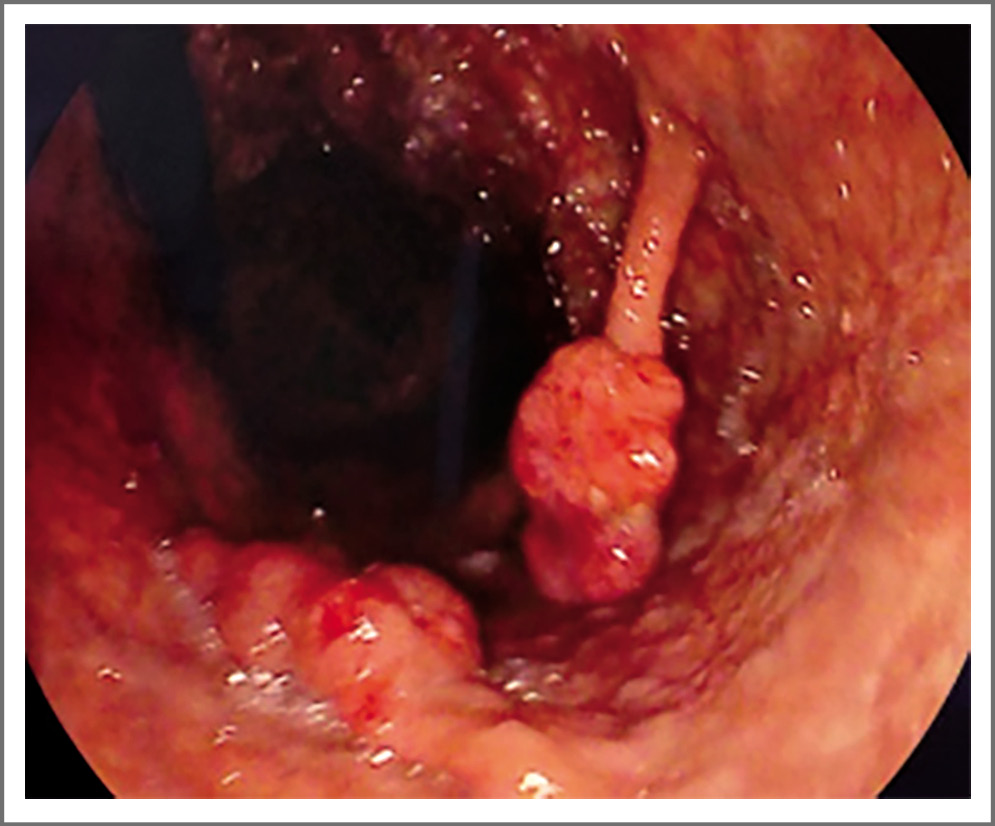 Рис. 2. Эзофагогастродуоденоскопия, гамартомный полип желудка до 2,5 см в диаметре. / Fig. 2. Esophagogastroduodenoscopy, hamartomatous polyp of the stomach up to 2.5 cm in diameter.