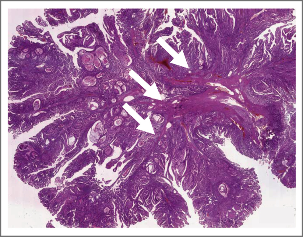 Рис 3. Типичное морфологическое строение гамартомного полипа тонкой кишки при СПЕ (окраска гематоксилин и эозин, увеличение ×5). Древовидно ветвящиеся пучки гладкомышечных волокон указаны стрелками. / Fig 3. Typical morphological structure of hamartomatous polyp of the small intestine in Peutz–Jeghers syndrome (hematoxylin and eosin, ×5). Tree-branching bundles of smooth muscle fibers are indicated by arrows.