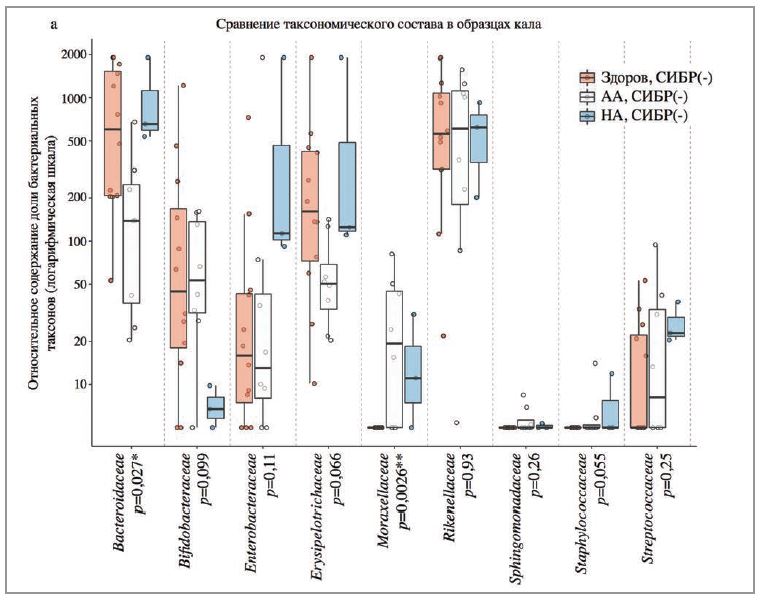 Сравнительный анализ таксономического состава метагеномных образцов кала выявил значимые изменения кишечного микробиома с учетом СИБР-статуса пациентов. В группе лиц, имеющих аллергический фенотип заболевания, выявлены достоверные различия на уровне отдельных классов, семейств и родов. Так, у пациентов группы АА СИБР(+) по сравнению с АА СИБР(-) отмечено снижение относительного количества бактерий, относящихся: к классам Negativicutes (77,9 vs 216,9; р=0,0008), Erysipelotrichia (69,5 vs 424,1; р=0,01), Bacteroidia (2521,2 vs 7200,5; р=0,05); к семействам Erysipelotrichaceae (69,5 vs 424,1; р=0,01), Pseudomonadaceae (0,7 vs 7,3; p=0,02), Rhodospirillaceae (0,4 vs 4,5; p=0,04), Bacillaceae (0,2 vs 0,7; p=0,02), увеличению Porphyromonadaceae (177,8 vs 158,8; р=0,02); к родам Barnesiella, Paraprevotella, Pyrolobus, Bifidobacterium, Pseudomonas, Coprobacter, Bacillus (р<0,05).