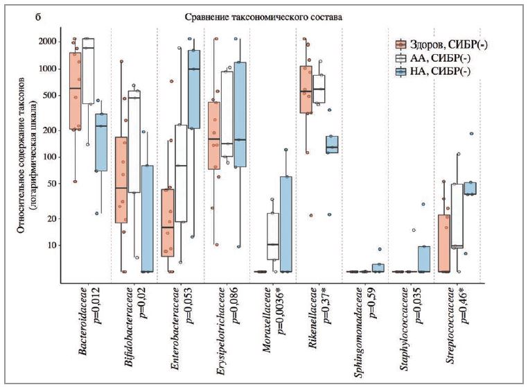 Распределение бактериальных семейств состава микробиоты кишечника в исследуемых подгруппах: б – в отсутствие СИБР. Примечание. Ширина прямоугольника – межквартильный интервал, отрезки – размах без выбросов.
