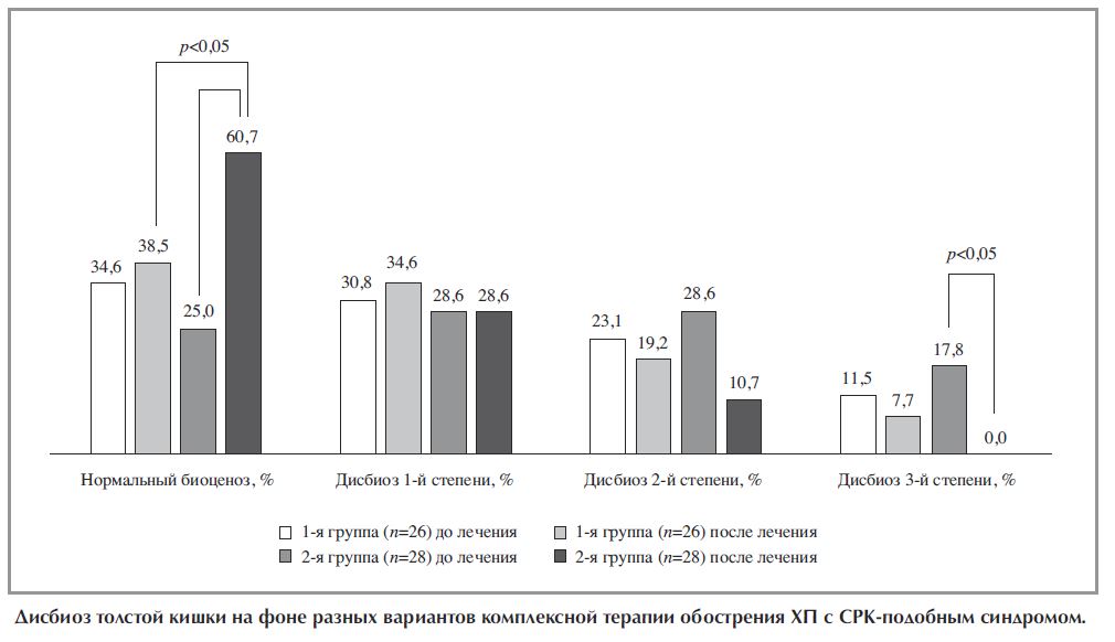 2. Дисбиоз толстой кишки на фоне разных вариантов комплексной терапии обострения ХП с СРК-подобным синдромом.