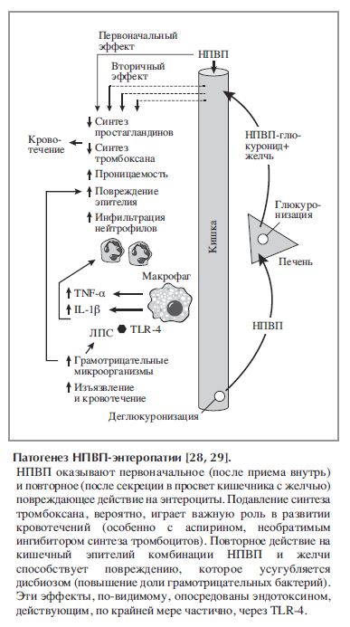 НПВП оказывают первоначальное (после приема внутрь) и повторное (после секреции в просвет кишечника с желчью) повреждающее действие на энтероциты. Подавление синтеза тромбоксана, вероятно, играет важную роль в развитии кровотечений (особенно с аспирином, необратимым ингибитором синтеза тромбоцитов). Повторное действие на кишечный эпителий комбинации НПВП и желчи способствует повреждению, которое усугубляется дисбиозом (повышение доли грамотрицательных бактерий). Эти эффекты, по-видимому, опосредованы эндотоксином, действующим, по крайней мере частично, через TLR-4.