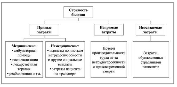 В данном случае оценка бремени болезни или анализ стоимости заболевания (cost of illness – COI) может выступать инструментом для выделения приоритетных направлений в развитии и повышении качества оказания медицинской помощи. Исследования по оценке бремени болезни могут позволить не только проанализировать социальные последствия заболевания (заболеваемость, распространенность заболевания, уровень инвалидности и т.д.), но и рассчитать экономические исходы (потери валового внутреннего продукта), затраты на медицинскую помощь, выплаты по инвалидности и пр.).