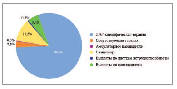 Для ЛАГ характерны более высокие затраты по сравнению с общей популяцией. Средние общие прямые медицинские затраты в месяц на пациента в 2,7–4 раза выше, чем в контрольной группе без ЛАГ, причем затраты до постановки этим больным диагноза и назначения специфической терапии также выше в 2 раза [18, 19]. Это связано не только с самой ЛАГ, которая приводит к увеличению частоты госпитализаций и амбулаторных визитов, но и коморбидными состояниями: артериальной гипертензией, сахарным диабетом (СД) с хроническими осложнениями, хронической обструктивной болезнью легких и др. Индекс коморбидности в группе ЛАГ был в 2–4 раза выше, чем в контрольной группе без ЛАГ [18, 20].