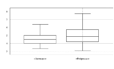 Показатель IQR/Me был почти во всех группах в пределах допустимого, но обращает на себя внимание IQR/Me (56%) в группе 3F2 при исследовании на УЗ-системе «Ангиодин».