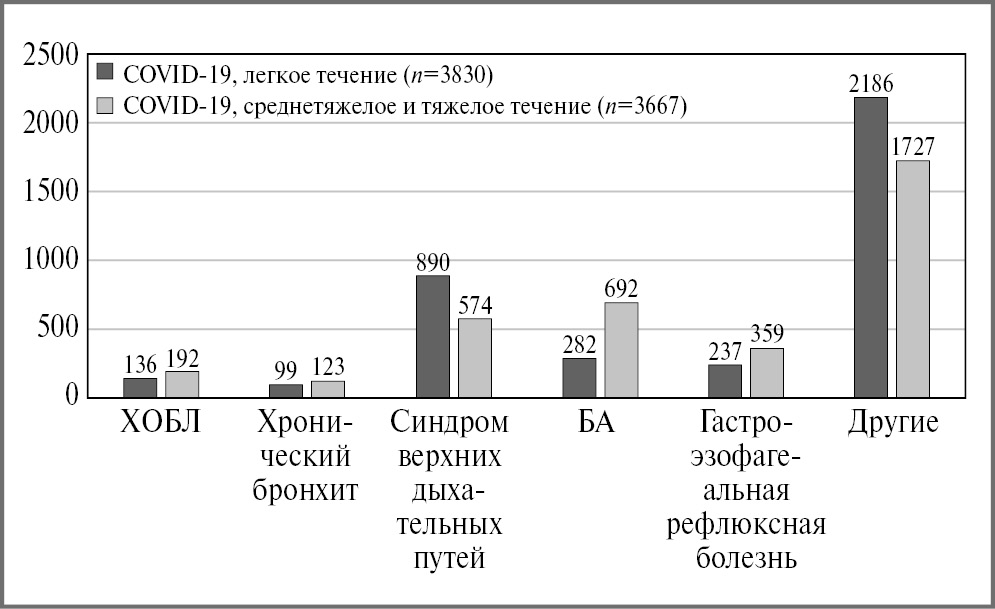 Определено, что факторами риска БОС являются атопия и частые ОРВИ в анамнезе, курение на текущее время и тяжелое течение острой фазы COVID-19. На частоту развития БОС в постковидном периоде оказал влияние уровень эозинофилов периферической крови, в большей степени при тяжелом течении COVID-19. Впервые диагностированные заболевания с БОС отражены на рис. 1. В том числе бронхиальная астма (БА) выявлена у 13% пациентов (n=974), хроническая обструктивная болезнь легких (ХОБЛ) – у 4,4 % (n=328).