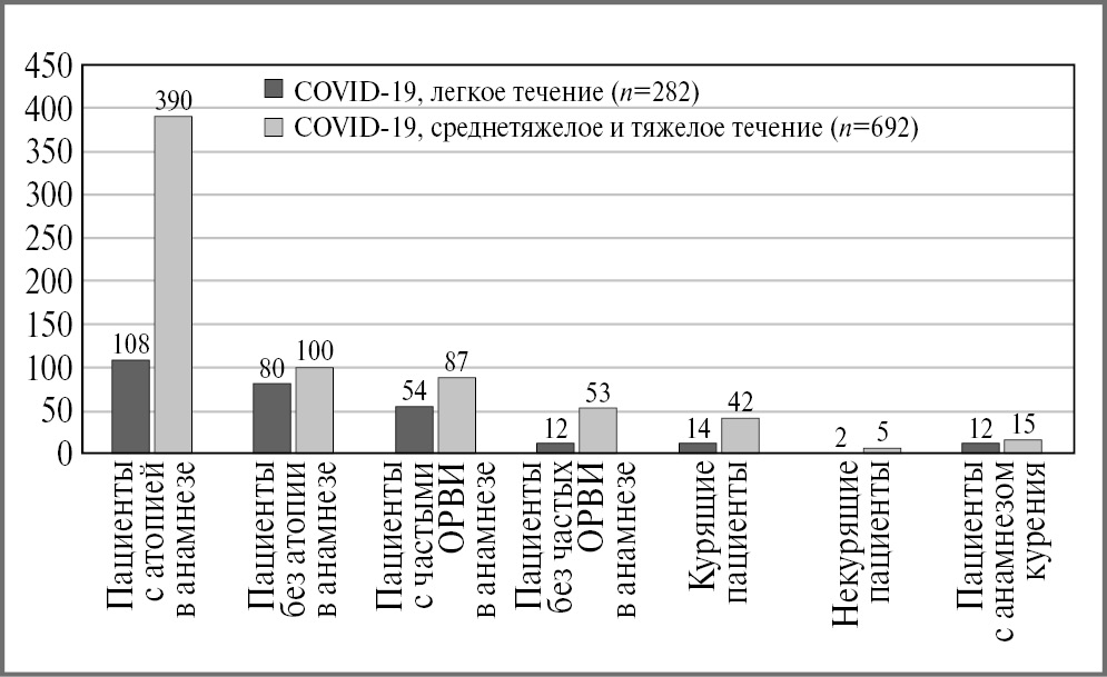 Рис. 2. Распределение больных с диагностированной БА в постковидном периоде, перенесших COVID-19 различной тяжести, с учетом факторов риска (n=974).