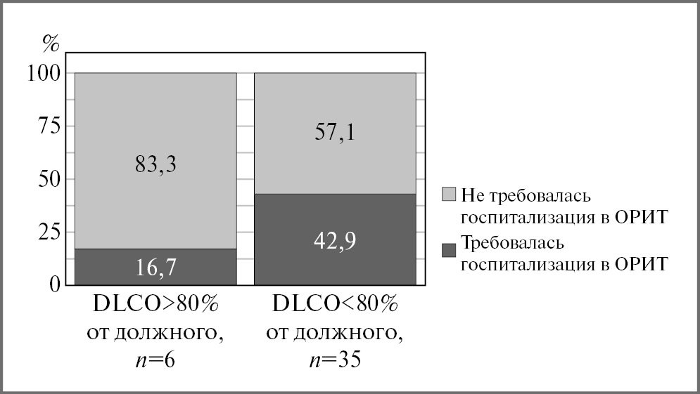 На рис. 3 представлены соотношения уровня DLCO через 12 мес от первых симптомов COVID-19 и необходимости пребывания в ОРИТ в остром периоде заболевания.