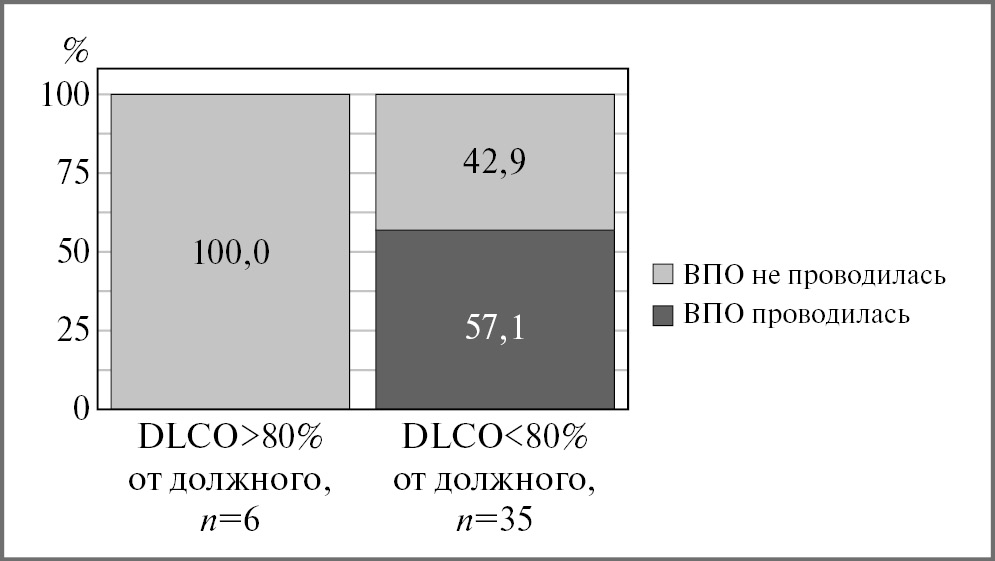 Соотношения уровня DLCO через 12 мес от первых симптомов COVID-19 и необходимости проведения ВПО в остром периоде заболевания отражены на рис. 4.