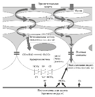 Примечание. СО пищевода выстлана многослойным плоским эпителием. Преэпителиальный механизм защиты состоит из муцина, бикарбонат-ионов. Эпителиальный уровень представлен самими эпителиальными клетками и межклеточными плотными контактами. Постэпителиальный уровень представлен кровеносным руслом.