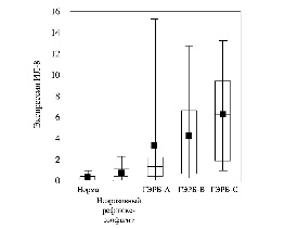 Примечание. На данном графике продемонстрировано отношение между экспрессией ИЛ-8 и эндоскопической картиной у пациентов с ГЭРБ и неэрозивной рефлюксной болезнью. Уровень цитокинов исследован методом полимеразной цепной реакции. Эндоскопическая картина оценивалась по наличию или отсутствию катарального воспаления СО, а также эрозий (согласно Лос-Анджелесской классификации: ГЭРБ-А – одна или несколько эрозий СО пищевода длиной менее 5 мм, ограниченные пределами одной складки СО; ГЭРБ-В – одна или несколько эрозий СО пищевода длиной более 5 мм, ограниченные пределами одной складки СО; ГЭРБ-С – множественные эрозии, поражение СО распространяется на две складки СО и более).