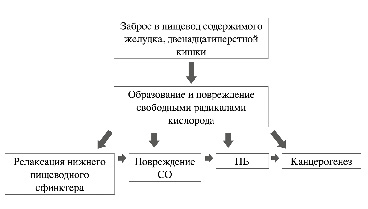 Образование свободных радикалов, индуцированное патологическим забросом содержимого из желудка или двенадцатиперстной кишки в пищевод, ассоциируется с процессом воспаления и канцерогенезом. При повреждении СО пищевода происходит образование свободных радикалов кислорода, которое, в свою очередь, индуцирует избыточное образование ПГ, способствующих релаксации НПС. В исследовании на лабораторных животных, проведенном L. Chen и соавт. (2004 г.), показано, что ПОЛ способствует метаплазии клеток СО пищевода и приводит к развитию ПБ и аденокарциноме пищевода.