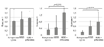 Примечание. На представленных графиках отражены изменения уровня экспрессии белков клаудина-1, 3 и 4 в СО пищевода лабораторных животных, которым моделировали рефлюкс-эзофагит. В контрольной группе наблюдалась большая площадь эрозий, что отражалось в меньшей степени уровня всех трех белков. В группе животных с комбинацией ИПП и ребамипида авторы исследования наблюдали наибольшую экспрессию при наименьшей площади эрозий.