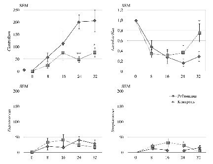 Примечание. На представленных графиках отражены изменения состава микробиоты пищевода у лабораторных животных из группы контроля и ребамипида. Ребамипид снижал уровень Clostridium spp. на 24 и 32-й неделях исследования и тормозил снижение Lactobacillus spp. на 32-й неделе моделирования. Различий в экспрессии Enterococcus spp. и Streptococcus spp. между контрольной группой животных и в группе животных, получавших ребамипид, авторы исследования не наблюдали. *p<0,01, **p<0,05.