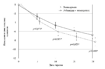 Примечание. На представленном графике отражено изменение симптомов у пациентов из групп наблюдения. Изменения авторы исследования определяли при помощи опроса с учетом эпигастральной боли, изжоги, чувства тяжести в эпигастрии и рвоты. У пациентов из группы ребамипида и эзомепразола отмечали более выраженное снижение среднего балла по всем перечисленным показателям в сравнении с группой пациентов с монотерапией эзомепразолом: -6,8±5,9 и -8,4±6,6 соответственно (p=0,009).